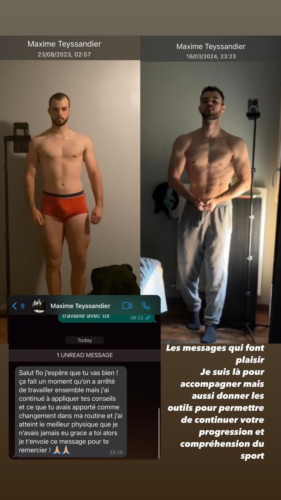 Sa fait maintenant 7 mois que je travail avec flo il m'a récupère en avril ou je préparer le regional de Lille en classic physique pour ma première compétition en junior, résultat je gagne la compétition Florian et quelqu'un de super sérieux et exemplaire, nous avons pu partager quelque séance d'entraînement ensemble corriger les mouvements etc, par la suite il a même pris le temps de faire une vidéo pour un débrif de la compétition vidéo disponible sur YouTube, maintenant les plan pour 2024 sont de prendre le plus de volume et de masse tout en gardant la ligne propre, Il a toute ma confiance je recommande à 100%, bien veillant surtout niveau santé c'est quelqu'un qui a des vrai valeur et je le respecter énormément. Je ne te dirai jamais assez merci pour tout le travail et le temps que tu a pris pour moi.